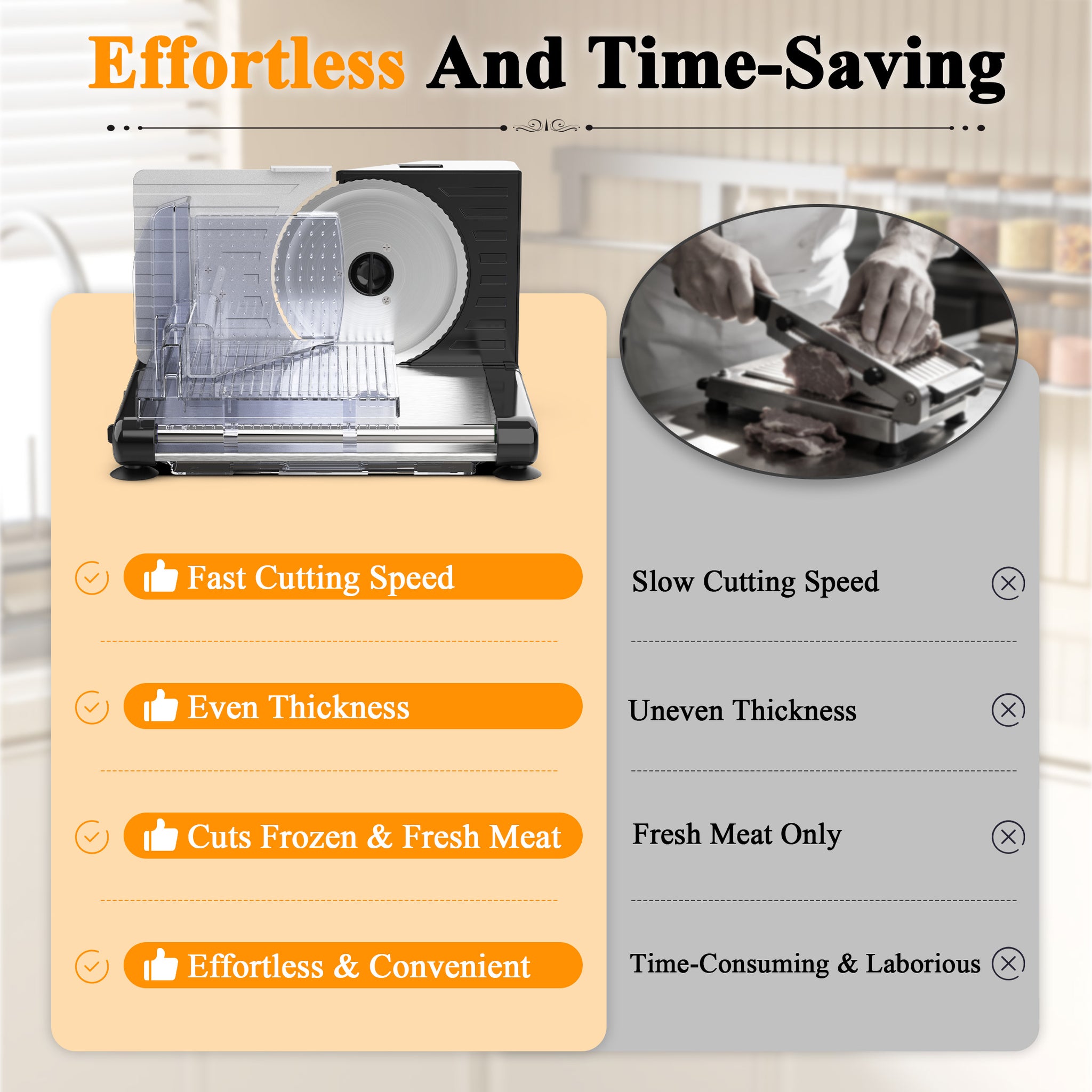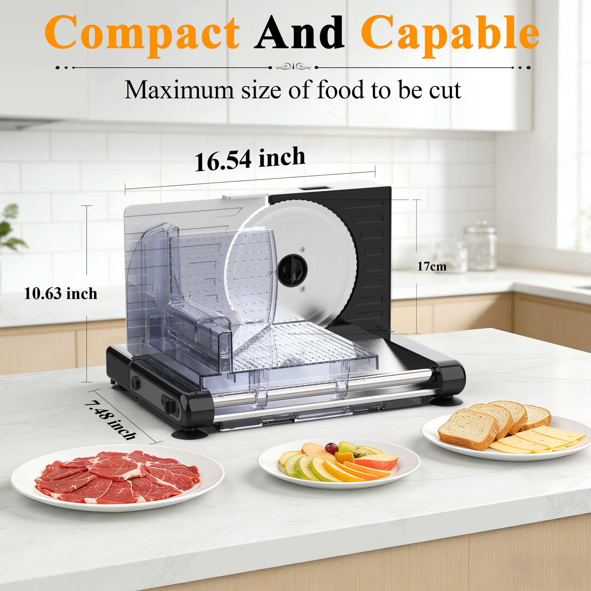 - Home Chef's Partner: The meat slicer provides precise cutting capability with adjustable thickness from 0 to 15mm, accommodating everything from ultra-thin to approximately 3/4 inch thick slices. It can slice meats, deli, cheese, bread, ham, vegetables, and fruits.