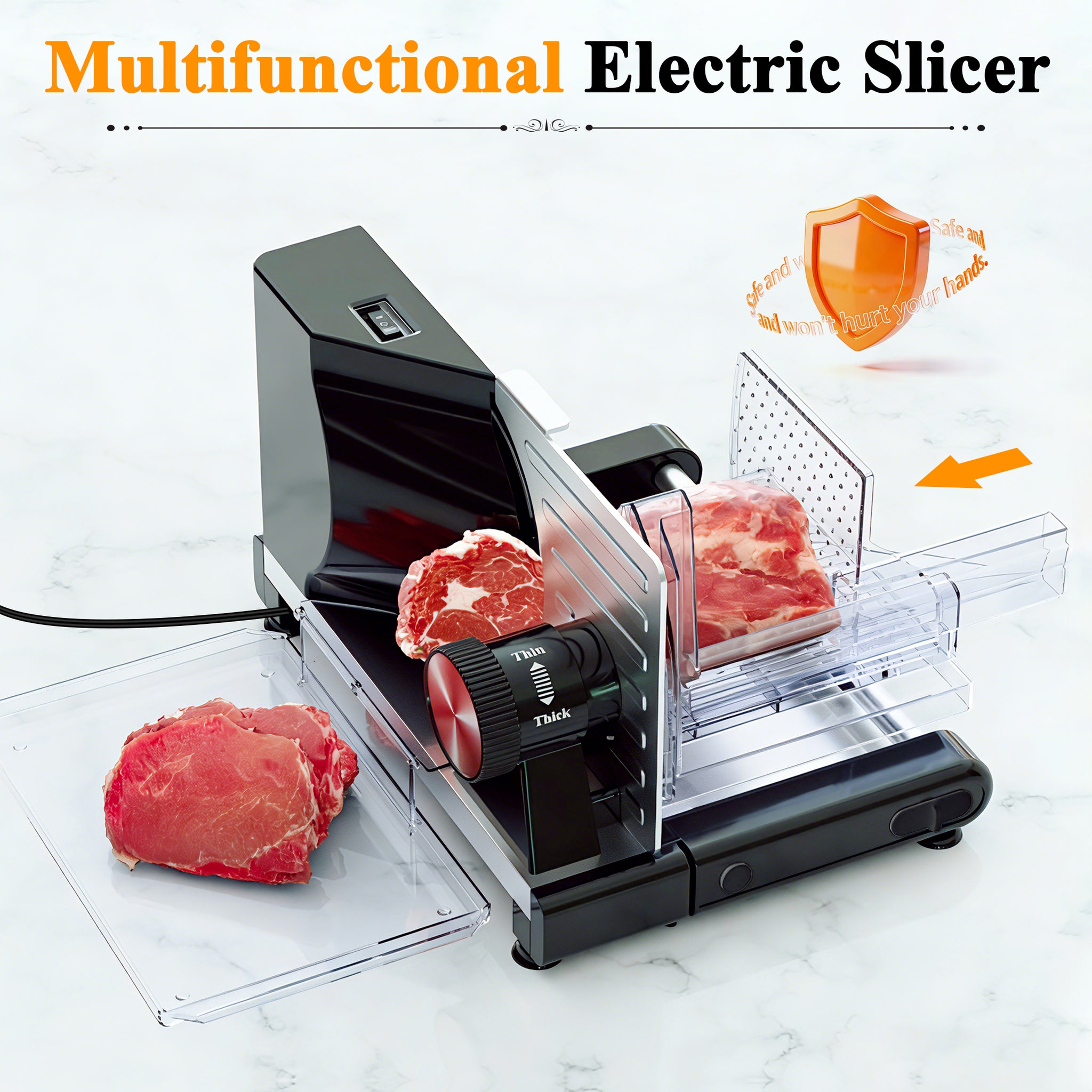 - Child Lock Protection: To operate the new slicer for deli meats, both the safety lock and power button must be pressed simultaneously, minimizing the risk of accidental activation and ensuring peace of mind for household use.